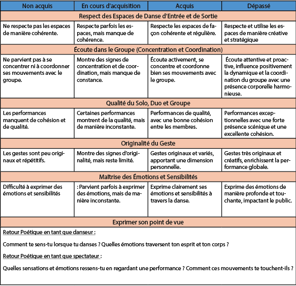 Visionner 4 fois la performance et organiser une co-évaluation ou une auto-évaluation afin que l’élève maîtrise les critères et développe son regard de spectateur.