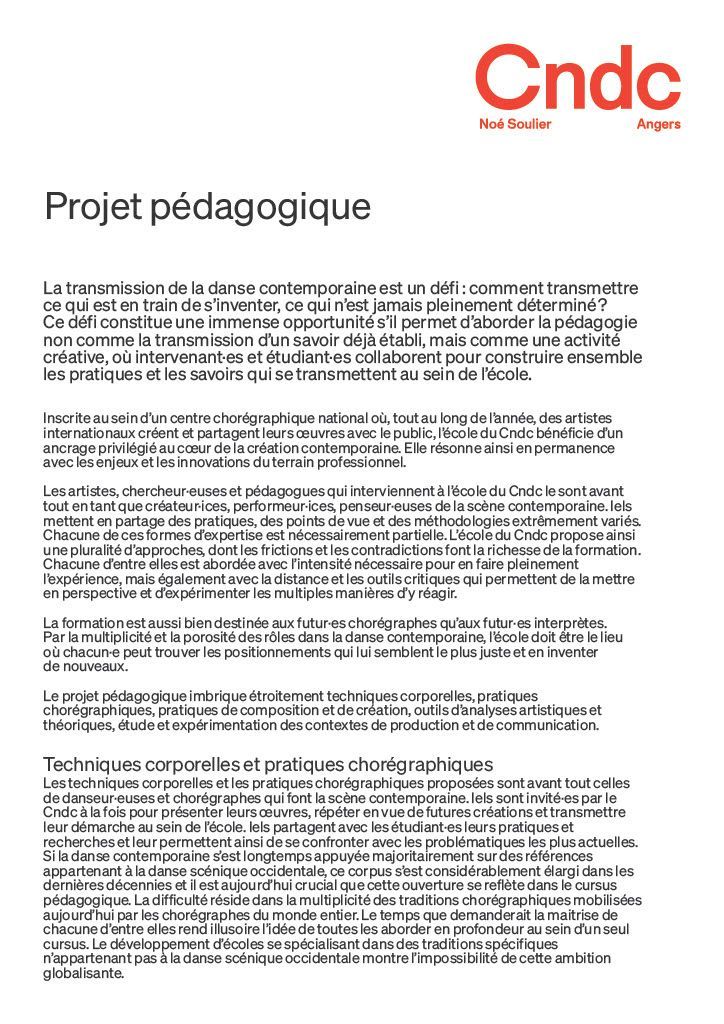 Seule école supérieure exclusivement dédiée à la danse contemporaine en France, l’école du Cndc propose aux futur·es artistes chorégraphiques (danseur·euses et/ou chorégraphes) une formation à temps plein en trois ans, accessible sur auditions.