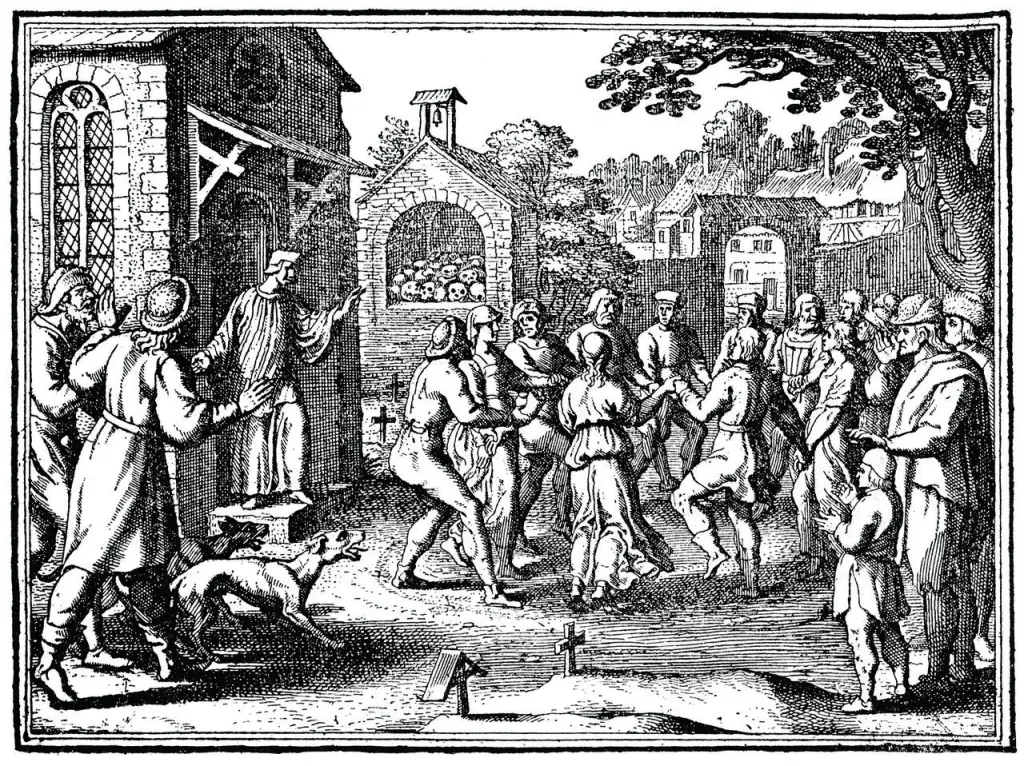 Une adolescente au 1er rang dans le public se lève, monte sur la scène, laisse tomber son masque et se joint aux autres en dansant. Une autre personne du public suit ce même chemin. Mais lorsqu’elle est sur le point de rejoindre la scène, son conjoint qui était assis dans la salle à côté d’elle tente de l’en empêcher. Duo d’opposition : l’homme veut à tout prix arrêter l’élan de sa femme. Avec acharnement, il la remet en arrière par portés, glissés. Ne prêtant aucune attention aux agissements de l’homme, elle est captivée, hypnotisée par la danse, comme un insecte attiré par la lumière. Craignant pour elle, il lui remet son masque qu’elle enlève aussitôt, il crie, se met en travers de sa route pour que l’être aimé ne soit pas contaminé par l’épidémie dansante. Elle se met à danser doucement. Il met sa main sur sa bouche comme un bâillon ce qui l’arrête un instant mais dès qu’elle s’en libère, elle se remet à danser et sous le regard de l’homme impuissant, le groupe l’entraîne dans sa folle farandole.