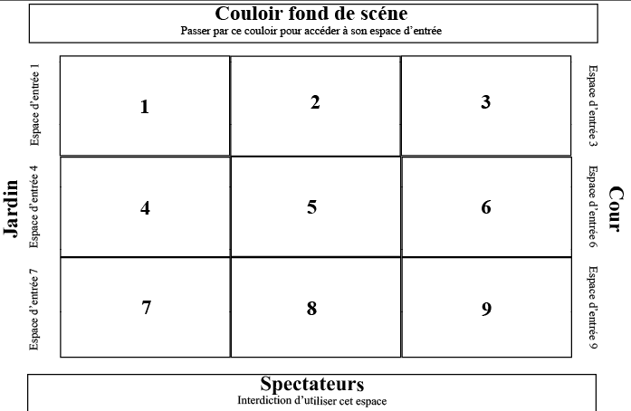 Le procédé de composition utilisé est le hasard. Quadriller l’espace scénique en 9. Tirer au sort : 3 espaces de représentation, 3 entrées, 3 sorties.