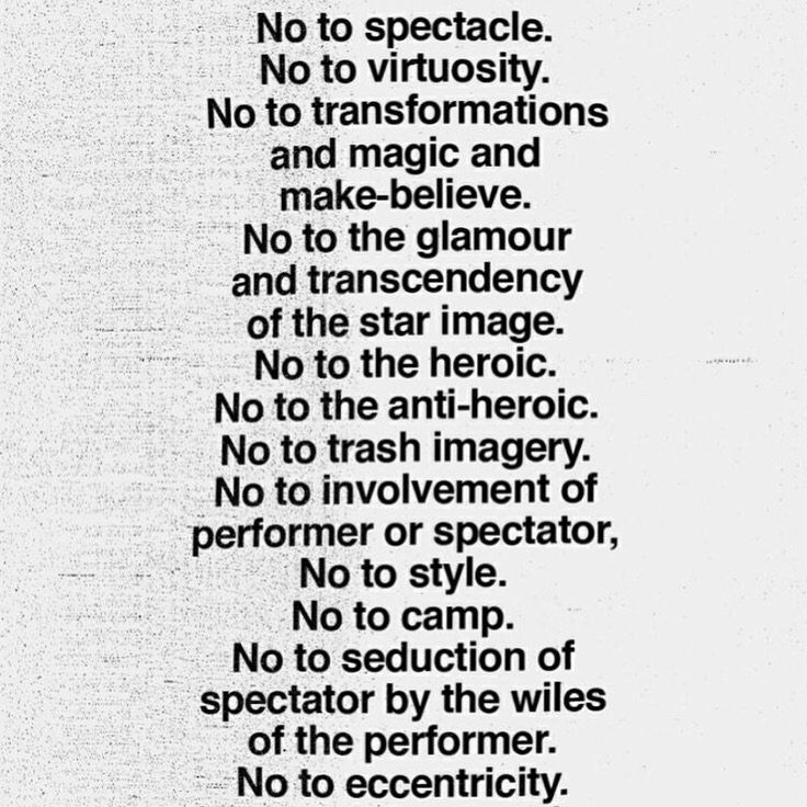 Une fois cette réflexion inaugurée, les danseurs-chorégraphes du Judson ne cessent de s’interroger sur la nature de leur démarche artistique. Le corps devient purement fonctionnel et impersonnel et la danse est débarrassée de toute justification, affirmant son autonomie. Yvonne Rainer se met alors en quête du « mouvement pur » qui selon elle est « un mouvement qui ne renvoie à rien d’autre » (Anne Livet, Contemporary Dance, 1978). Pour Trio A (1966), elle intervient sur une scène au décor tout à fait dépouillé, effectuant une série de gestes simples sans transition ni fil conducteur. Le même mouvement est répété à cinq reprises, avant qu’un nouveau ne soit introduit dans la suite. Cette réflexion peut faire écho aux évolutions colorées de Brice Marden et notamment au Mur chez Yvon Lambert (1973), au sens où la chorégraphie, tout comme la peinture, n’est que déclinaison d’un même motif sur le même rythme. Avec cette composition, Rainer met en évidence l’aspect conceptuel de la danse, conçue comme un art élémentaire dénué de temps forts.